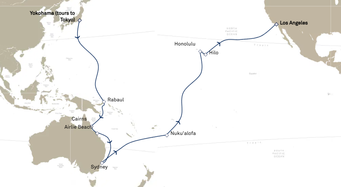 9 ports from Yokohama (Tokyo) to Los Angeles